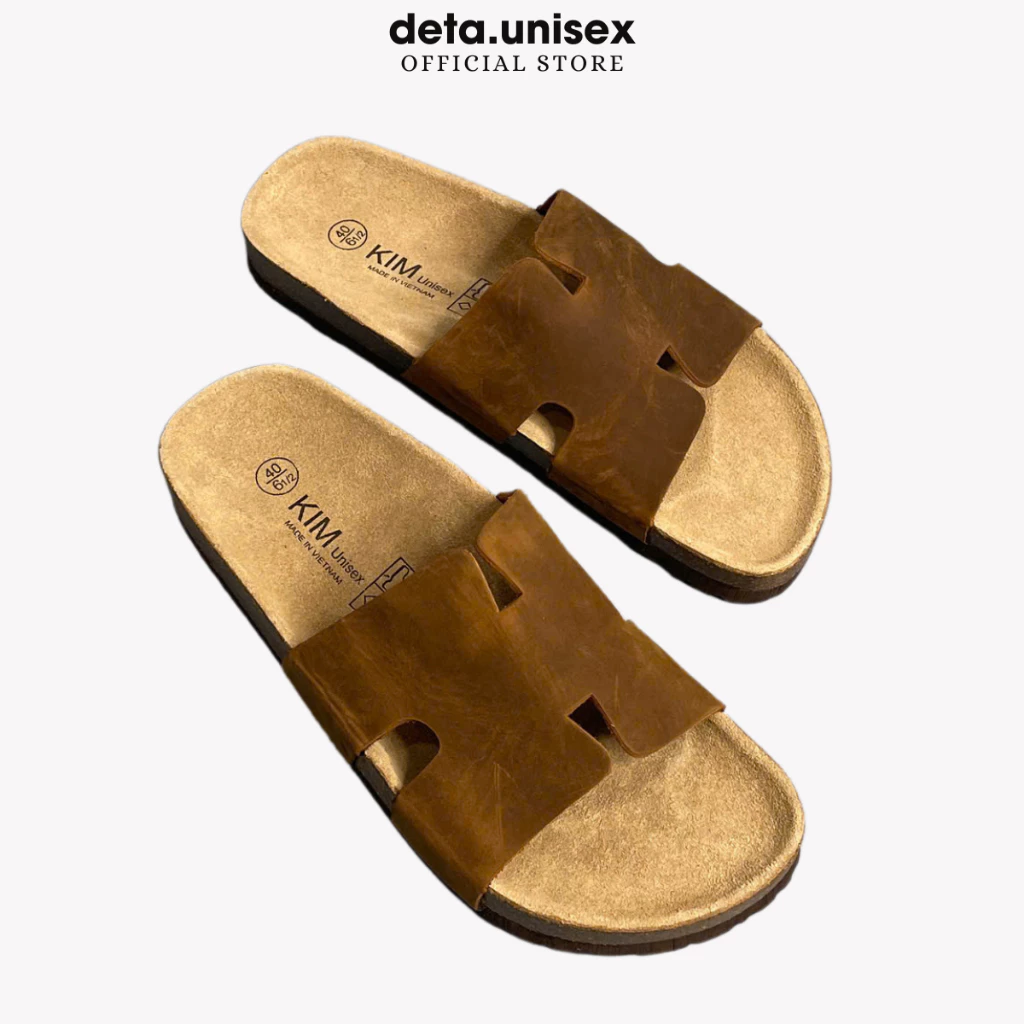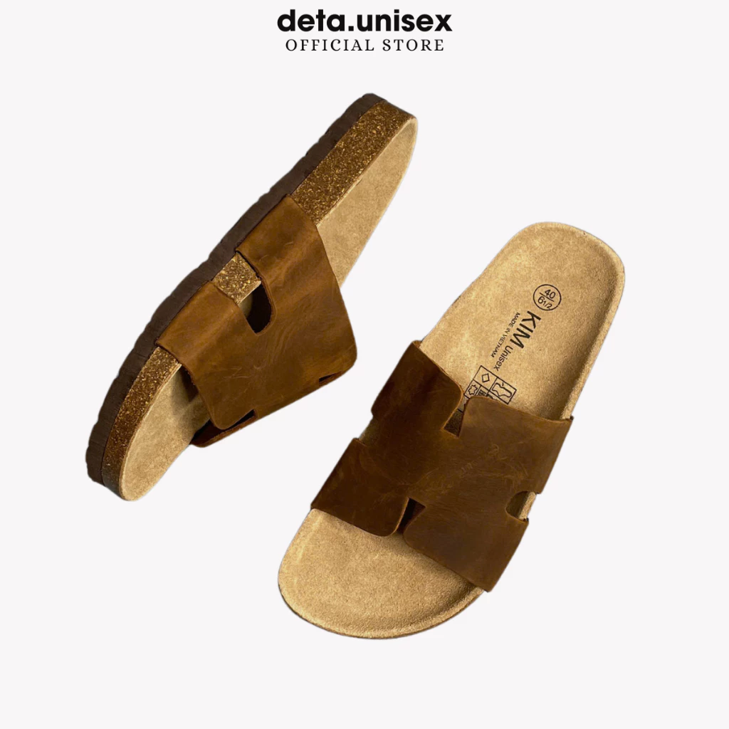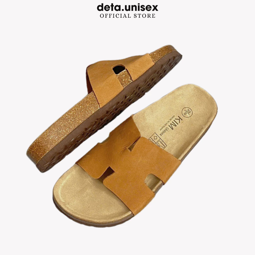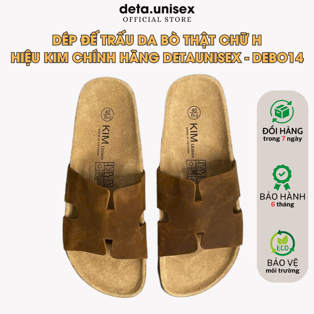 Dép đế trấu da bò thật chữ H hiệu KIM chính hãng Detaunisex - DEBO14